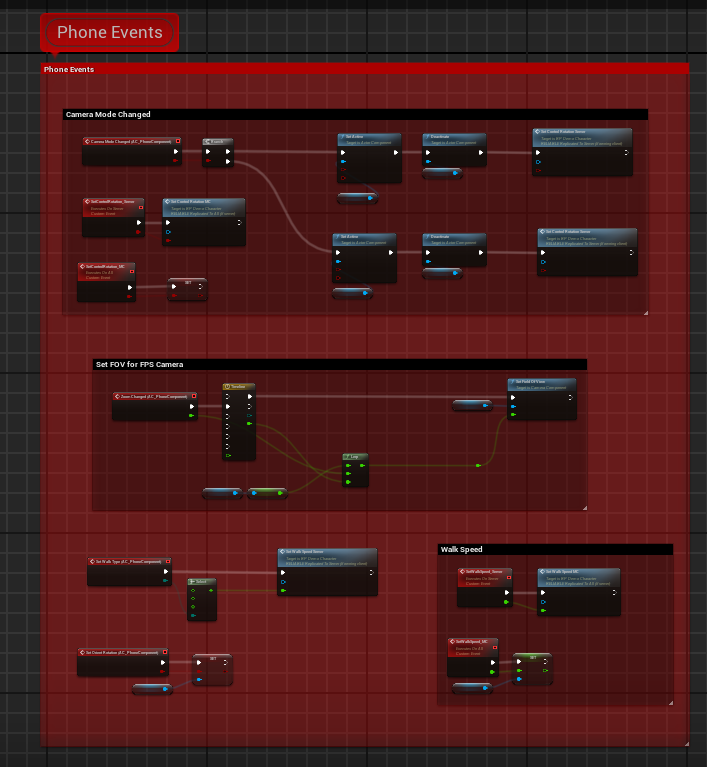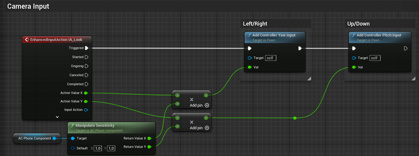 \*To reduce mouse sensitivity while using the camera zoom, use the Manipulate Sensitivity function from the AC\_PhoneComponent. Multiply your Input Action values by the return values of this function as shown in the image below. This will ensure your camera movement feels smooth and controlled during zoom.