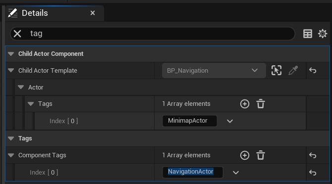 Add a Child Actor Component and select <mark style="color:$success;">**BP\_Navigation**</mark> as the class. Then search for `tag` and add the <mark style="color:$success;">**NavigationActor**</mark> tag.