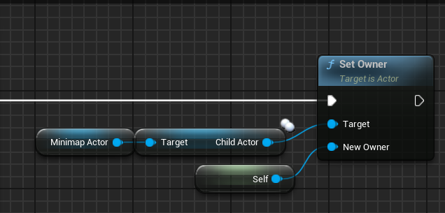 \*After adding the component, you must go to your Character Blueprint's BeginPlay event. Get the Child Actor Component and use the Get Child Actor node to get the minimap actor reference. Then, use the Set Owner node and set your character (Self) as the New Owner. This is required for the minimap to track your location and rotation.